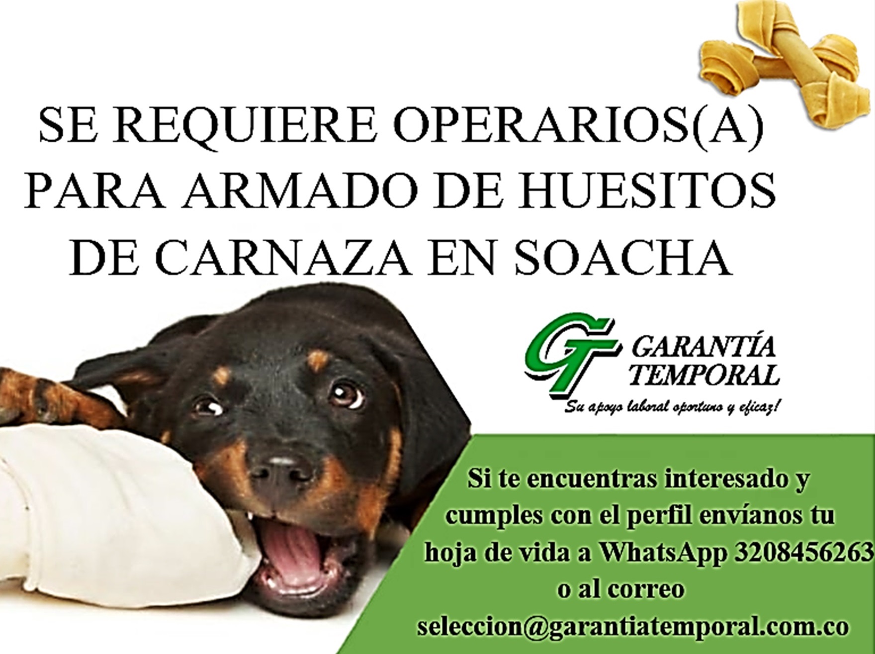 Importante empresa dedicada a la fabricación de huesitos de carnaza ubicada en Soacha, requiere vincular personal operativo de manera inmediata, requisitos tener experiencia mínima de 1 año realizando en BLANQUEO DE CARNAZA -EXPERIENCIA EN CURTIEMBRES, Preferiblemente que vivan en Soacha o alrededores.