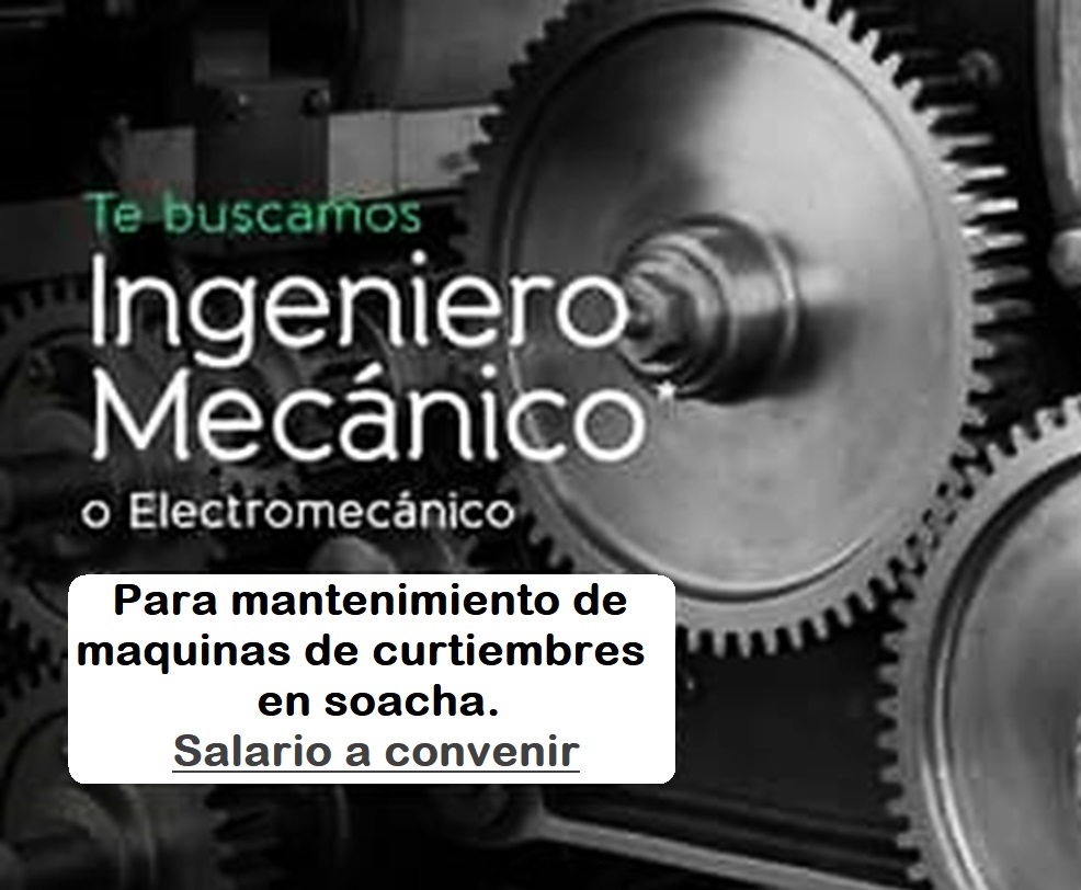 Reconocida empresa dedicada a la fabricación de huesitos de carnaza ubicada en Soacha, se encuentra en la búsqueda de hombre para LIDER ELECTROMECANICO debe contar con mínimo 2 años de experiencia en mantenimientos de maquinarias de curtiembres.